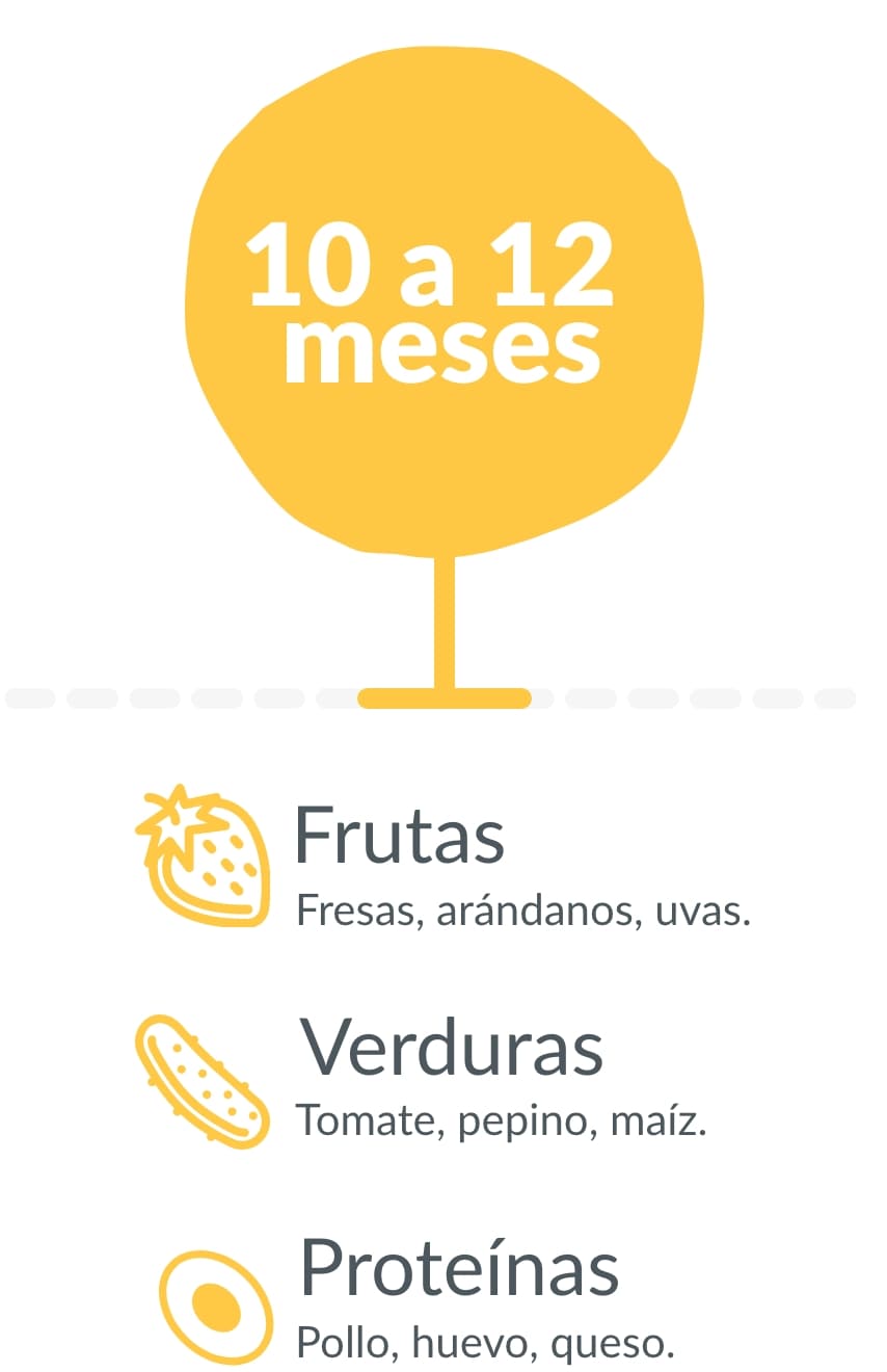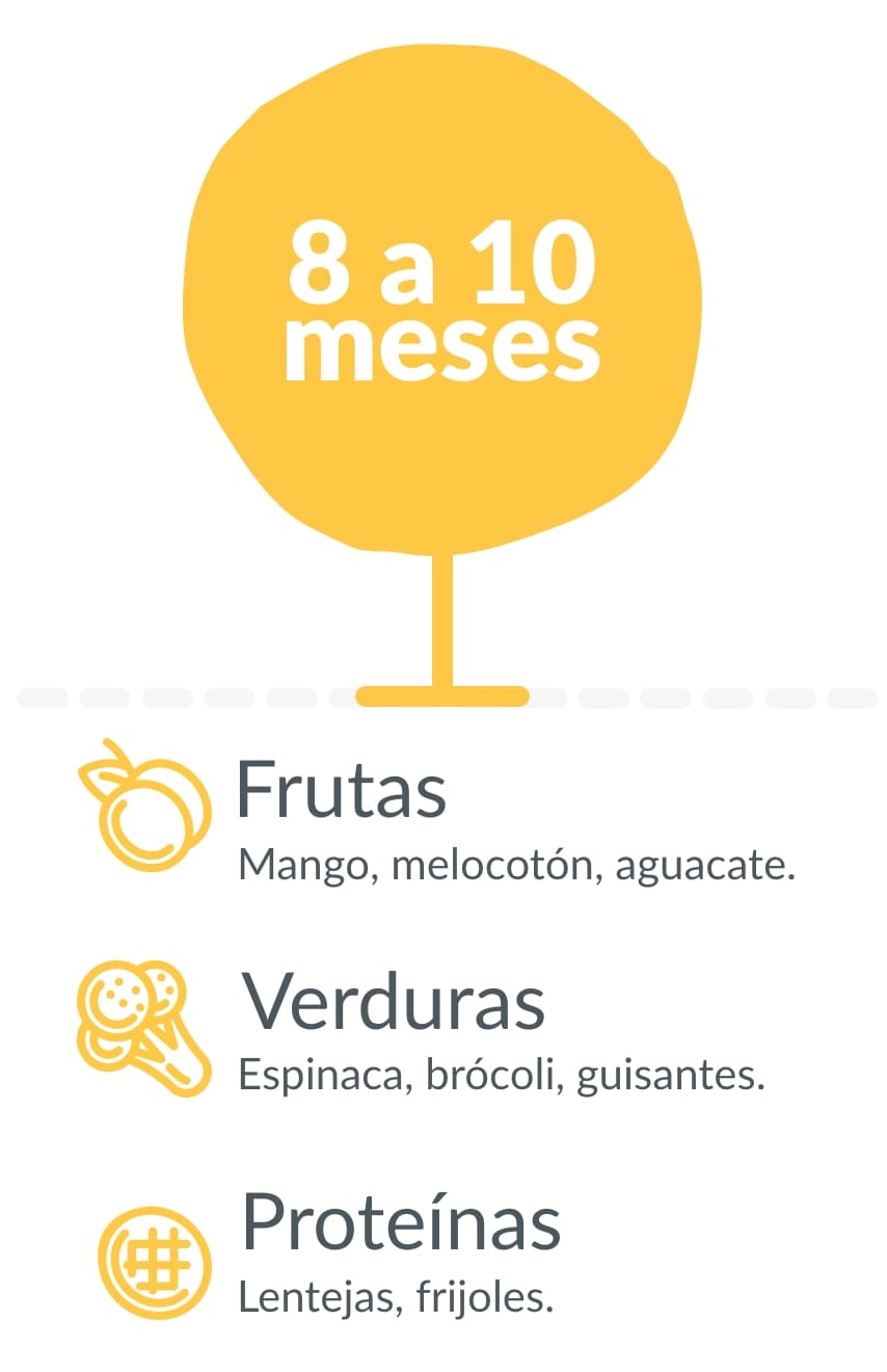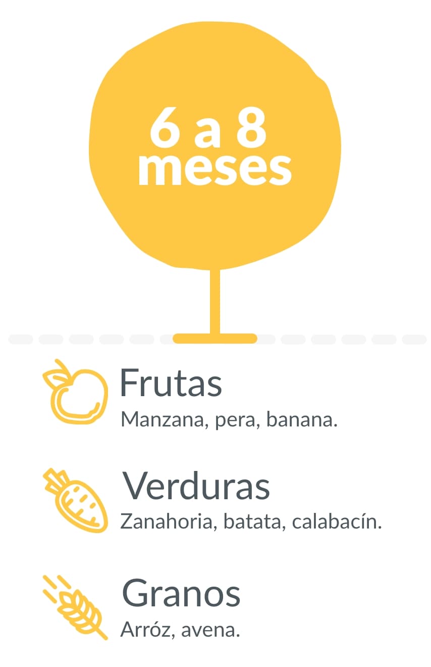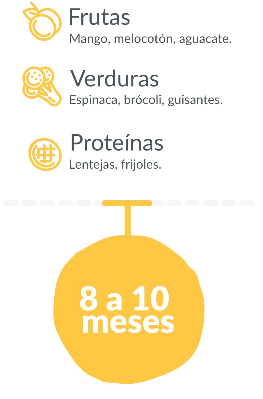 Evita azúcares añadidos, lácteos (fuera de la edad sugerida, excepto leche materna o fórmula), Carnes(fuera de la edad sugerida), pescados, huevos crudos, embutidos y alimentos con sal.