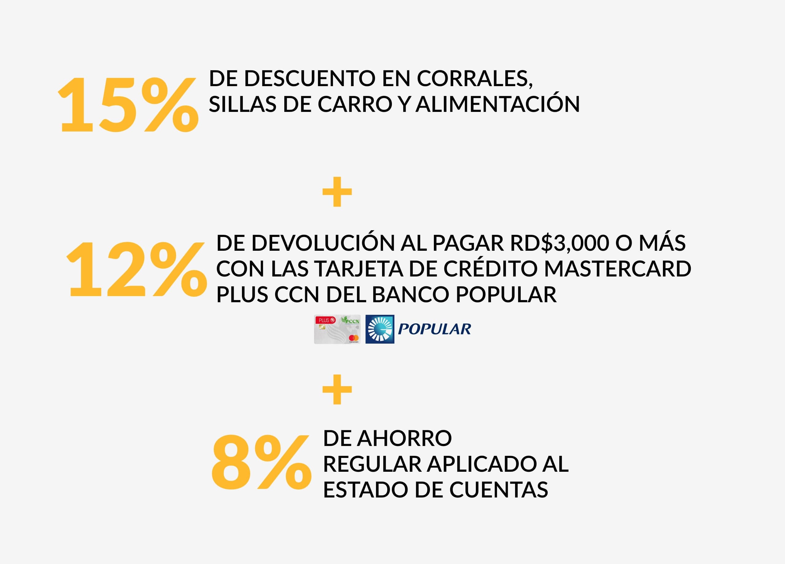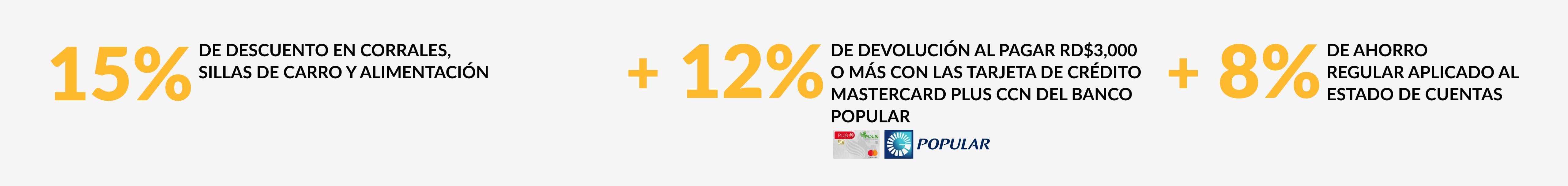 Recibe 12% de devolución + 8% ahorro regular en toda la compra al pagar RD$3,000.00 o más con la tarjeta de crédito Mastercard Plus CCN del Banco Popular.