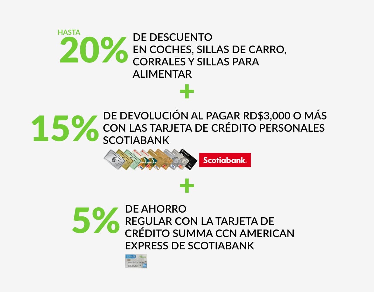 Promoción aplica en toda la tienda física y online desde el viernes 19 al domingo 21 de septiembre 2025. Mínimo de consumo para aplicar a la devolución RD$3,000.00. El monto máximo de devolución RD$3,000.00 por cliente, sobre el acumulado de consumos realizados con las tarjetas participantes. Los consumos realizados con las tarjetas adicionales serán sumados a la tarjeta principal. El 15% será acreditado a más tardar 45 días calendario luego de finalizado el Período de Vigencia, más 5% de ahorro regular al pagar con la Tarjeta de Crédito Suma CCN American Express®, reflejado en su Estado de Cuenta. Aplica la tarjeta Suma CCN American Express® Scotiabank. ®Marca Registrada de The Bank of Nova Scotia, utilizada bajo licencia. American Express es una marca de American Express. Las tarjetas son emitidas por Scotiabank República Dominicana bajo licencia de American Express. Consulta los T&C en do.scotiabank.com/promociones.